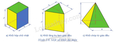 Mỗi khối đa diện có kích thước chiều dài, chiều rộng của đáy (hoặc cạnh đáy) và chiều cao được thể hiện trên hình.