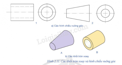 Quan sát hình 2.11 để xác định các hình chiếu vuông góc tương ứng với các khối tròn xoay nào?