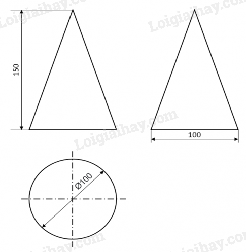 Lựa chọn tỉ lệ thích hợp, vẽ hình chiếu vuông góc của khối nón có đường kính đáy d = 100 mm, chiều cao nón h = 150 mm.