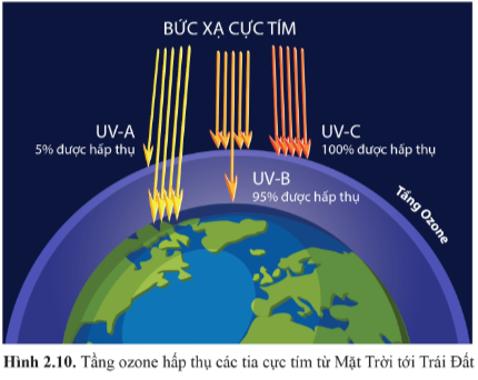 - Quan sát hình 2.10 và mô tả khả năng hấp thụ của các bức xạ cực tím UV-A, UV-B, UV-C của tầng ozone.