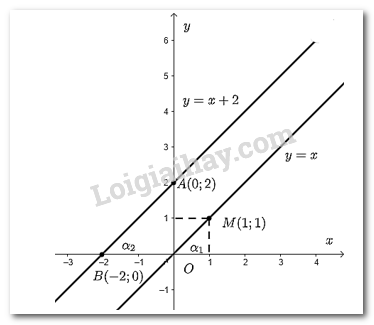 b) Góc tạo bởi hai đường thẳng \(y = x\) và \(y = x + 2\) với trục \(Ox\) lần lượt là \({\alpha _1}\) và \({\alpha _2}\).