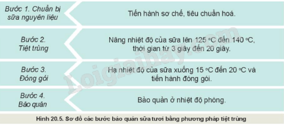 Quan sát Hình 20.5 và mô tả các bước bảo quản sữa tươi bằng phương pháp tiệt trùng. Nêu điểm giống và khác nhau giữa phương pháp thanh trùng và phương pháp tiệt trùng. Phân biệt sữa tươi thanh trùng và sữa tươi tiệt trùng.