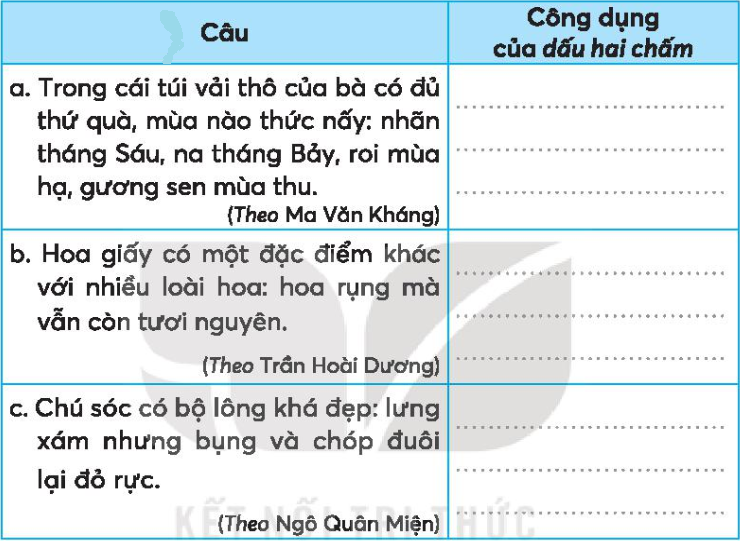 Em dựa vào kiến thức đã học về công dụng của dấu hai chấm để hoàn thành bài tập.