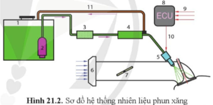 Quan sát hình 21.2, cho biết cấu tạo chung và nguyên lí làm việc của hệ thống nhiên liệu phun xăng.