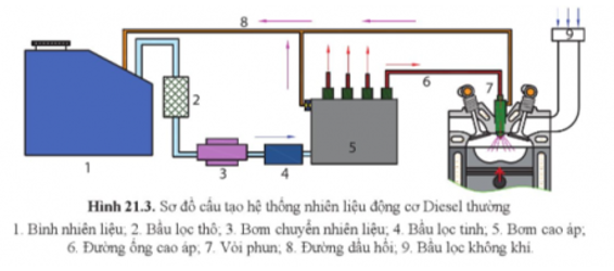 Quan sát hình 21.3. cho biết cấu tạo chung và nguyên lí làm việc của hệ thống nhiên liệu động cơ Diesel thường.