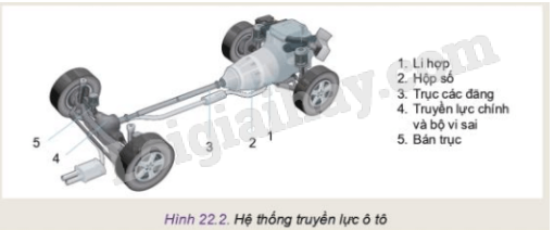 Hãy quan sát Hình 22.2 và cho biết mô men chủ động từ động cơ được truyền đến các bánh xe sau thông qua những bộ phận nào. Tác động vào bộ phận nào để có thể ngắt mô men chủ động truyền đến bánh xe đó?