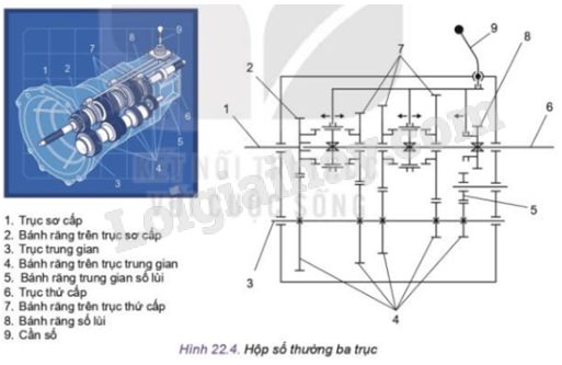 Hãy quan sát Hình 22.4 và so sánh tỉ số truyền của hộp số ở hai vị trí: khi bánh răng (7) ở bên trái và khi bánh răng (7) ở giữa được nối với trục thứ cấp.
