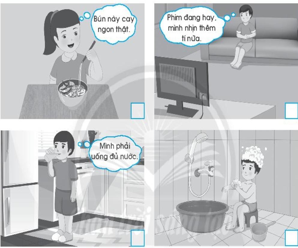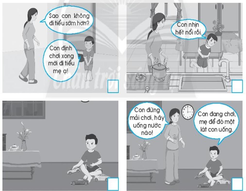 Điền số từ 1 đến 4 vào ◻ ở các hình chỉ diễn biến của một câu chuyện. Viết vào chỗ (…) lời khuyên của em dành cho bạn Nam trong câu chuyện đó.