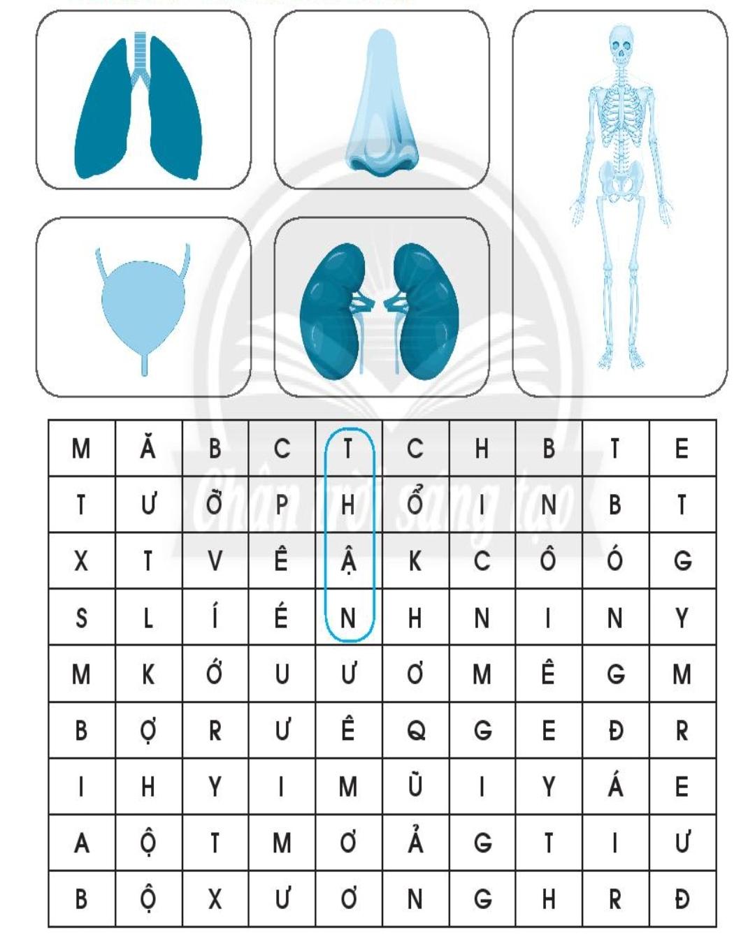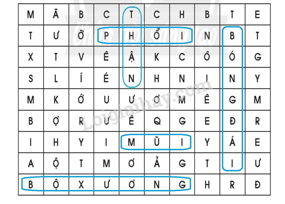 Quan sát hình và tìm khoanh các từ chỉ tên gọi phù hợp trong bảng chữ dưới đây theo mẫu.
