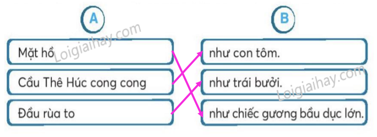 Bài văn tả những cảnh đẹp nào ở Hồ Gươm? Khi nói “cầu Thê Húc cong cong như con tôm” là tác giả so sánh phương diện nào của cầu Thê Húc? Xếp các từ ngữ (cong cong, rùa, lớn, trái bưởi, thanh kiếm, xum xuê) vào cột thích hợp. Nối từ ngữ ở cột A với từ ngữ phù hợp ở cột B để tạo câu. Viết 1 – 2 câu về những điều em thấy thú vị về quê hương, đất nước.