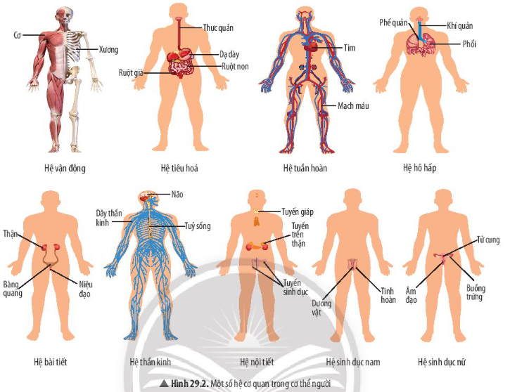 Quan sát Hình 29.2 và liệt kê từng cơ quan có mặt trong các hệ cơ quan, dự đoán vai trò chính của hệ cơ quan theo hiểu biết thực tiễn.