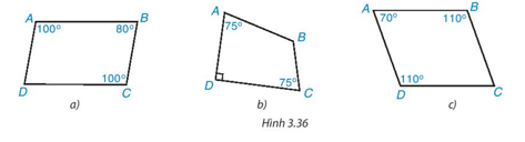 Vậy tứ giác ABCD trong Hình 3.36a) và 3.36c) là hình bình hành; tứ giác ABCD trong Hình 3.36b) không là hình bình hành.