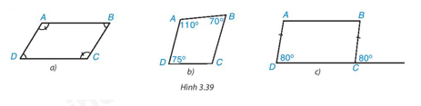 Vậy tứ giác ABCD trong Hình 3.39a) và 3.39c) là hình bình hành; tứ giác ABCD trong Hình 3.39b) không là hình bình hành.