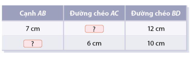 Cho hình thoi \(ABCD\). Hãy tìm độ dài thích hợp cho các ô ? trong bảng dưới đây: