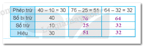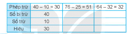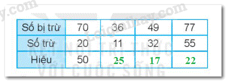 Xác định số bị trừ, số trừ, hiệu trong mỗi phép tính rồi ghi vào ô trống cho thích hợp.