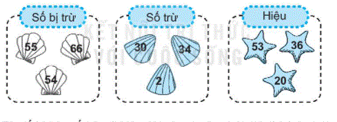 Từ số bị trừ, số trừ và hiệu, lập được các phép trừ thích hợp là: 55 – 2 = 53; 66 – 30 = 36; 54 – 34 = 20.