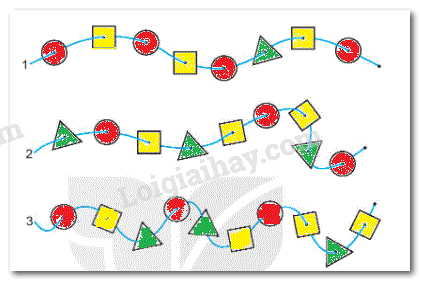 a) Quan sát ba dây ở trên rồi tô màu đỏ vào các hình tròn, màu vàng vào các hình vuông, màu xanh vào các hình tam giác.