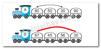 Trên mỗi toa tàu ghi một số. a) Đổi chỗ hai toa của đoàn tàu B để được các số sắp xếp theo thứ tự từ bé đến lớn bằng cách vẽ mũi tên. (theo mẫu).