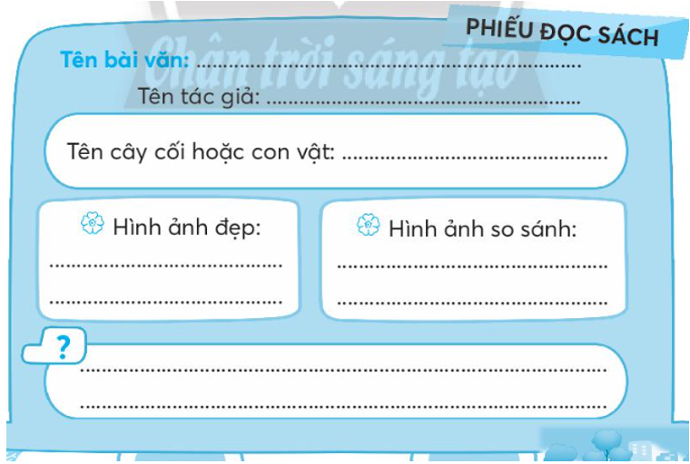 Viết vào Phiếu đọc sách những nội dung em thích sau khi đọc một bài văn về cây cối hoặc con vật.
