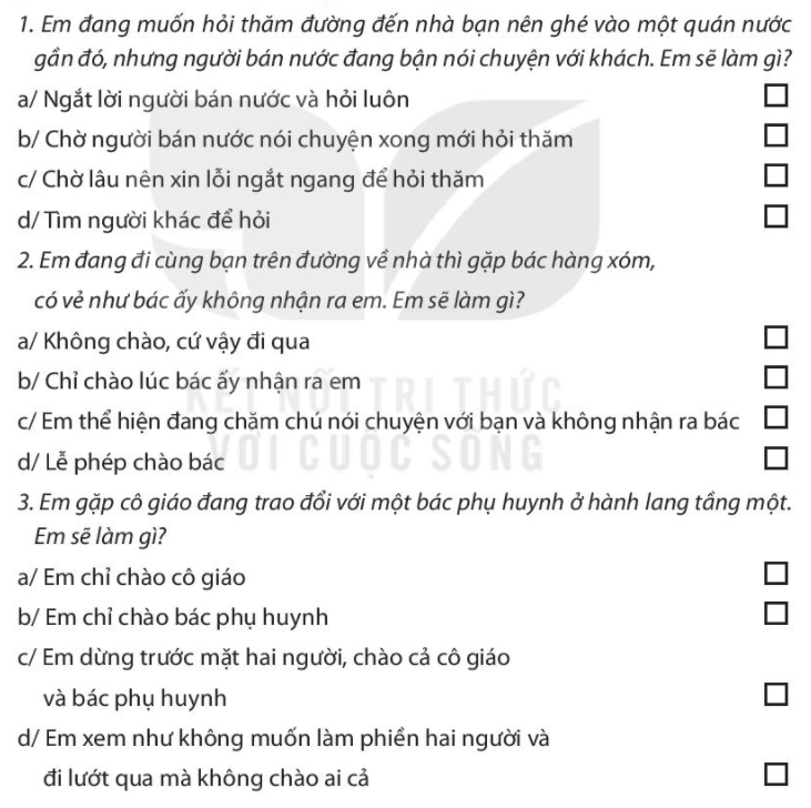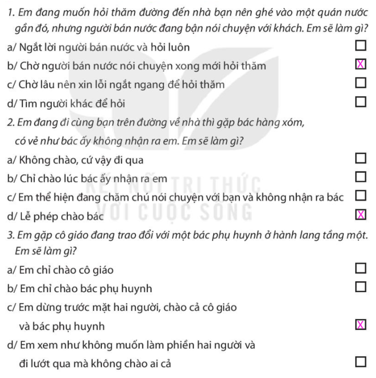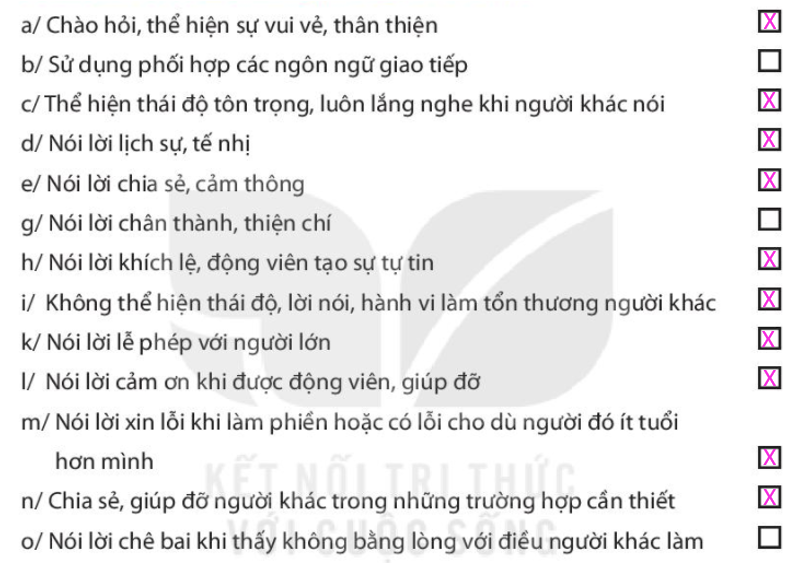 Nêu những điều em đã thực hiện được trong các tình huống giao tiếp hằng ngày. Đánh dấu X vào ô trống ở những phương án em chọn. Xác định những điều em nên và không nên thực hiện khi giao tiếp với. Lựa chọn cách xử lí tình huống phù hợp. Hãy viết ra một tình huống em đã thể hiện khi giao tiếp mà em thích nhất. Em đã thay đổi cách nói như thế nào để người khác không bị tổn thương. Em đã thay đổi cách nói như thế nào để động viên, khích lệ người khác.