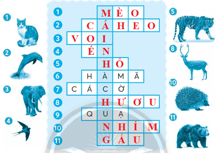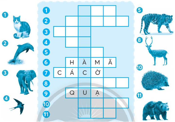 Quan sát kĩ các hình ảnh về các loài động vật, gọi tên đúng và viết tên con vật vào ô chữ.