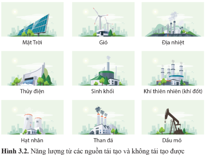 Từ các nguồn năng lượng ở hình 3.2, bạn hãy phân năng lượng ở Trái Đất thành hai dạng: năng lượng tái tạo và năng lượng không tái tạo.
