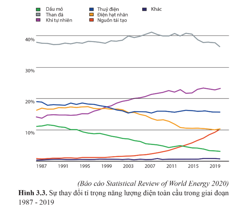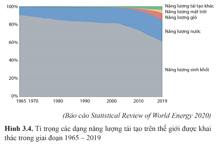 Quan sát đồ thị hình 3.3 và nhận xét sự thay đổi tỉ trọng năng lượng điện sản xuất từ các nguồn năng lượng tái tạo.