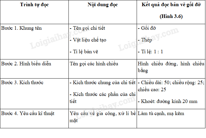 Đọc bản vẽ chi tiết gối đỡ (Hình 3.6) theo trình tự trên Bảng 3.1.