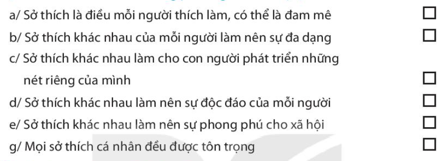 Những ý kiến nào dưới đây phù hợp với suy nghĩ của em về sở thích?