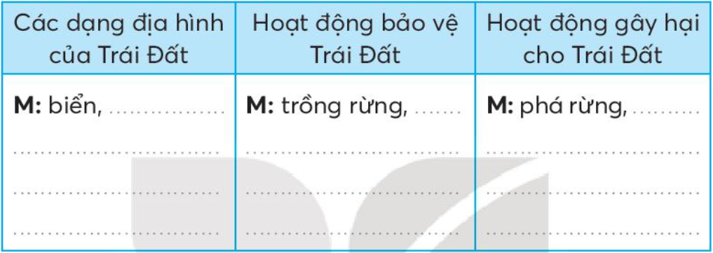 Xếp các từ ngữ dưới đây vào cột thích hợp. Ghi lại câu hỏi, câu trả lời của em và bạn về nội dung tranh dưới đây. Chuyển những câu dưới đây thành câu cảm hoặc câu khiến. Đặt một câu kể, một câu hỏi, một câu cảm, một câu khiến với những từ ở bài tập 1. Đọc bài Ếch nhỏ và đầm lầy hoặc tìm đọc sách báo viết về hành tinh xanh của chúng ta và viết thông tin vào phiếu đọc sách.