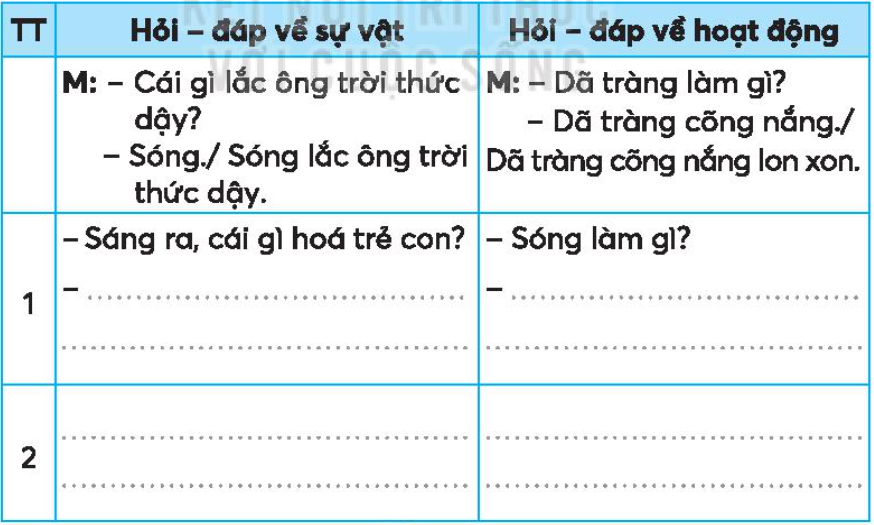 Viết 2 cặp câu hỏi – đáp về sự vật, hoạt động được nói đến trong đoạn thơ ở bài tập 1.