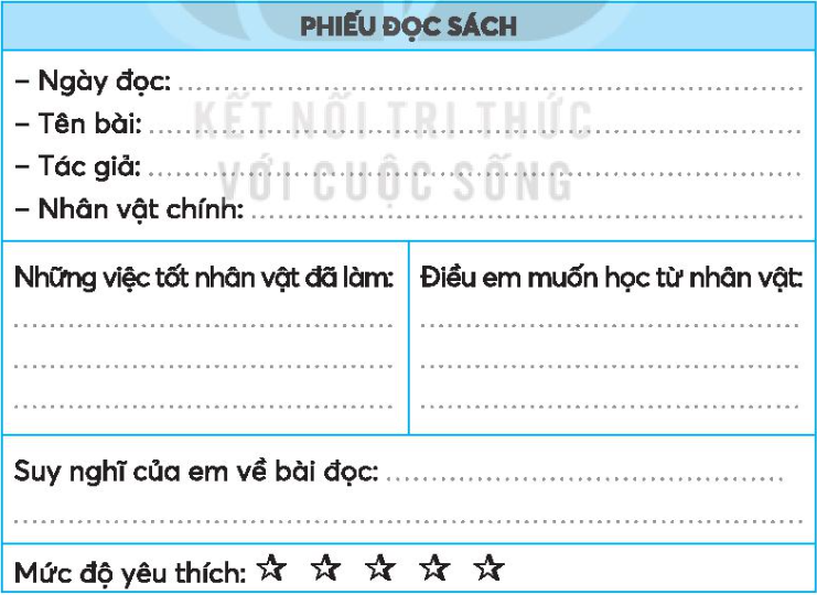 Đọc văn bản Bác lái xe bệnh viện hoặc tìm đọc câu chuyện, bài văn, bài thơ,... về một nhân vật được mọi người quý mến, cảm phục và ghi thông tin vào phiếu đọc sách.