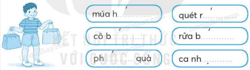 Trong bài đọc, khi thấy ông bị đau, Việt đã làm gì để giúp ông? Đánh dấu vào ô trống trước dòng gồm từ ngữ tả dáng vẻ của Việt. Điền ch hoặc tr, at hoặc ac vào chỗ trống. Viết từ ngữ chỉ hoạt động của từng người trong tranh. Viết 4 câu có sử dụng từ ngữ vừa tìm được phù hợp với 4 tranh ở bài tập 4. Viết 3 – 5 câu kể về một công việc em đã làm cùng người thân.