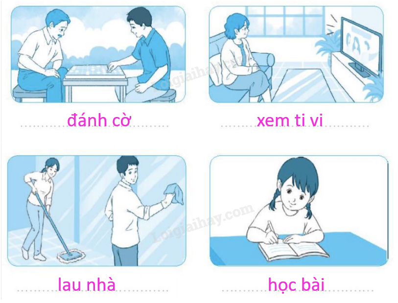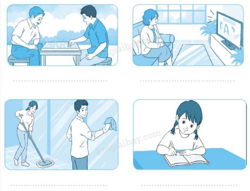 Em quan sát kĩ các bức tranh xem những nhân vật trong đó đang làm gì rồi viết những từ chỉ hoạt động ở phía dưới.