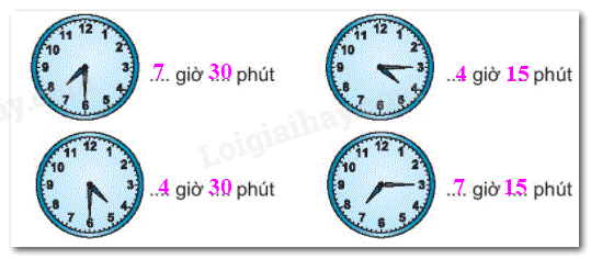 Quan sát đồng hồ rồi điền số thích hợp vào chỗ chấm.