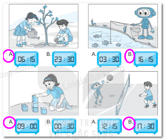 Khoanh vào chữ đặt trước đồng hồ chỉ thời gian thích hợp cho hoạt động ở mỗi bức tranh.
