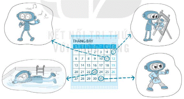 Quan sát tranh rồi viết các ngày phù hợp với từng hoạt động của Rô-bốt.