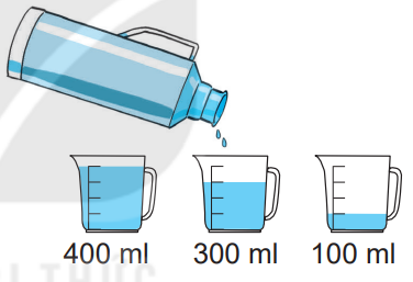Trong bình có 1 $\ell $ nước. Việt rót nước từ trong bình đó vào đầy một ca 500 ml và một ca 300 ml. Hỏi trong bình còn lại bao nhiêu mi-li-lít nước?