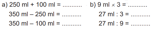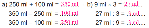 Thực hiện tính rồi viết đơn vị ml theo sau kết quả vừa tìm được.