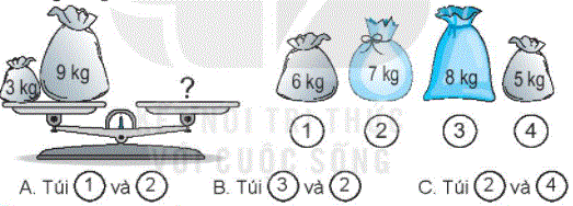 Em hãy tính nhẩm tổng khối lượng của hai trong bốn túi gạo sao cho bằng với khối lượng ở đĩa cân bên trái rồi chọn đáp án đúng.