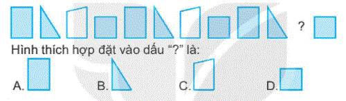 Quan sát ta thấy các hình được sắp xếp theo quy luật: hình chữ nhật, hình tam giác, hình tứ giác, hình vuông rồi tiếp tục lặp lại theo thứ tự như vậy. Từ đó tìm được hình thích hợp đặt vào dấu ?