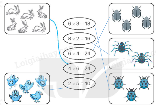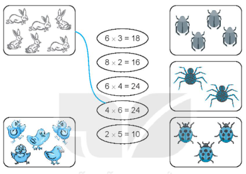 Tìm số chân của mỗi nhóm các con vật rồi nối với phép nhân có kết quả bằng với số chân đó.