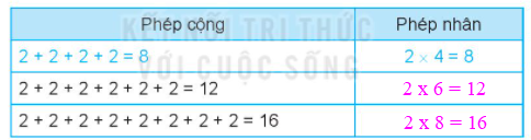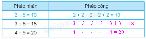 Viết các phép nhân thành tổng các số hàng bằng nhau rồi tính kết quả.