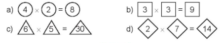 Tô màu đỏ vào các thừa số, màu xanh vào tích tương ứng trong mỗi phép nhân sau