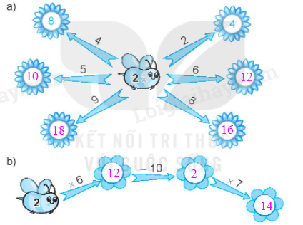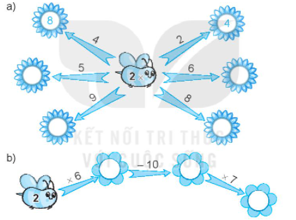 b) Tính nhẩm theo chiều mũi tên và ghi kết quả vào mỗi bông hoa.