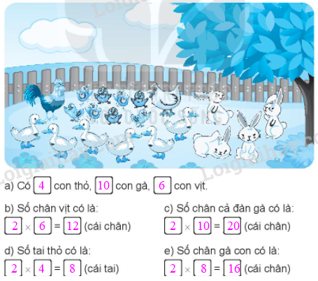 Quan sát hình vẽ, đếm số con thỏ, con gà, con vịt rồi viết phép nhân thích hợp vào ô trống.
