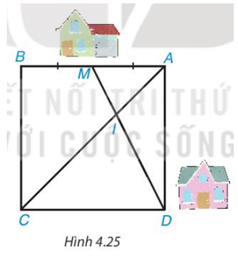 Nhà bạn Mai ở vị trí M, nhà bạn Dung ở vị trí D (Hình 4.25), biết rằng tứ giác ABCD là hình vuông và M là trung điểm của AB. Hai bạn đi bộ với cùng một vận tốc trên con đường MD để đến điểm I. Bạn Mai xuất phát lúc 7h. Hỏi bạn Dung xuất phát lúc mấy giờ để gặp bạn Mai lúc 7h30 tại điểm I?