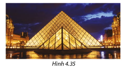 Kim tự tháp tại bảo tang Louvre (Pháp) có dạng hình chóp tứ giác đều với chiều cao \(21,6m\) và cạnh đáy dài \(34m\) (Hình 4.35). Hỏi thể tích của kim tự tháp bằng bao nhiêu mét khối?