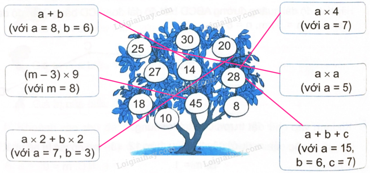 Nối mỗi biểu thức với quả bưởi ghi giá trị của biểu thức đó.