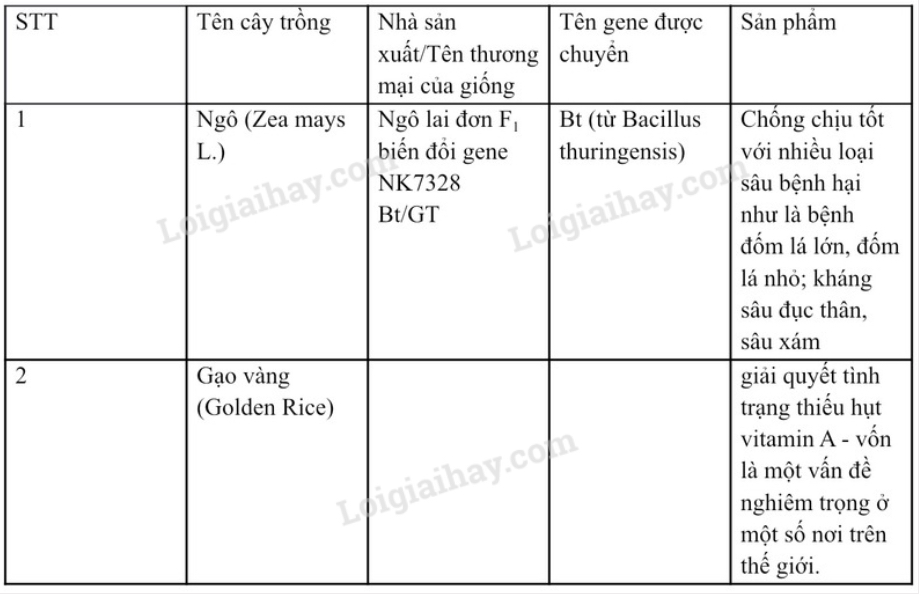 - Tìm hiểu sản phẩm chuyển gene là các loại cây trồng biến đổi gene, động vật chuyển gene.